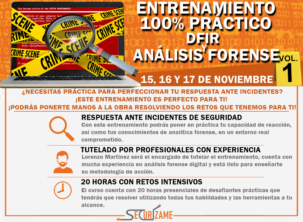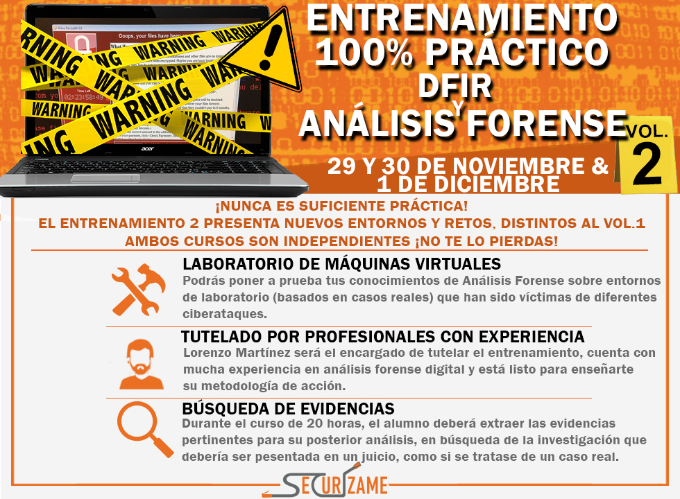 Ambos entrenamientos están desarrollados en entornos diferentes con casos distintos, siendo independientes el uno del otro, siendo ambos una gran opción para practicar análisis forense y respuesta ante incidentes. Se llevarán a cabo bajo la tutela del reconocido perito informático Lorenzo Martínez y algún otro miembro del equipo de Securízame. Con una duración de 20 horas reales e intensivas (cada uno).
